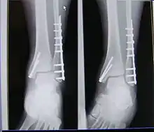 A trimalleolar fracture is a fracture of the ankle that involves the lateral malleolus, the medial malleolus, and the distal posterior aspect of the tibia, which can be termed the posterior malleolus. The trauma is sometimes accompanied by ligament damage and dislocation.[1]