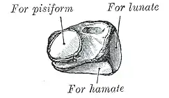The volar surface presents, on its medial part, an oval facet, for articulation with the pisiform; its lateral part is rough for ligamentous attachment.