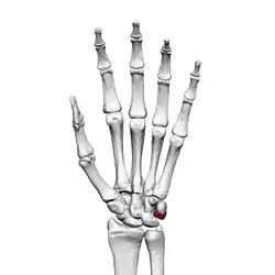 The triquetral is one of the eight carpal bones of the hand. It is a three-faced bone found within the proximal row of carpal bones. Situated beneath the pisiform, it is one of the carpal bones that form the carpal arch, within which lies the carpal tunnel. [1]:708