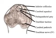 The nucleus of the trochlear nerve is located in the caudal mesencephalon beneath the cerebral aqueduct. It is immediately below the nucleus of the oculomotor nerve (III) in the rostral mesencephalon.