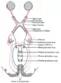 ![]() The cranial nerve nuclei schematically represented; dorsal view. Motor nuclei in red; sensory in blue. (Trochlear is "IV") | |