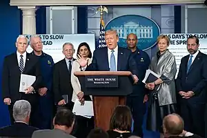 - "Remarks by President Trump, Vice President Pence, and Members of the Coronavirus Task Force in Press Briefing". whitehouse.gov. March 16, 2020. Retrieved May 11, 2020 – via National Archives.