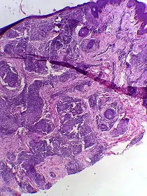 | Skin biopsy in tuberculoid leprosy showing multiple peri-appendageal granulomas. | |