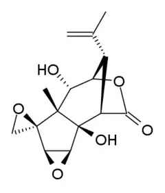 Tutin is a polyoxygenanted polycyclic sesquiterpene from the picrotoxane family.[5] Tutin is one of a series of chemically and pharmacologically similar compounds of which picrotoxinin[6][7] and coriamyrtin[8] have been mostly studied. Conroy[9][10] proposed the structure for picrotoxinin, which was confirmed by X-ray crystallographic studies and also determined the absolute configuration of the molecule.[11][12] Karyone and Okuda proposed the tutin[13] structure based on the pictrotoxinin structure and chemical degradation studies. The structure of tutin including absolute stereochemistry was confirmed by X-ray crystal analysis[5][14] together with chemical and chiroptical means.[15][16] Tutin has a highly strained skeleton, including two epoxide rings and a lactone, which is susceptible to various rearrangements. Tutin has a characteristic intensely bitter taste. Tutin is very soluble in acetone, but dissolves moderately in chloroform and is insoluble in carbon disulfide or benzene. Addition of strong sulfuric acid to a few drops of a saturated aqueous solution of tutin results in a blood-red coloration.[17]