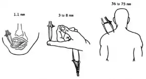 Two-point discrimination (2PD) is the ability to discern that two nearby objects touching the skin are truly two distinct points, not one. It is often tested with two sharp points during a neurological examination[1]:632[2]:71 and is assumed to reflect how finely innervated an area of skin is. In clinical settings, two-point discrimination is a widely used technique for assessing tactile perception.[3] It relies on the ability and/or willingness of the patient to subjectively report what they are feeling and should be completed with the patient’s eyes closed.[4] The therapist may use calipers or simply a reshaped paperclip to do the testing.[5] The therapist may alternate randomly between touching the patient with one point or with two points on the area being tested (e.g. finger, arm, leg, toe).[4] The patient is asked to report whether one or two points was felt. The smallest distance between two points that still results in the perception of two distinct stimuli is recorded as the patient's two-point threshold.[6] Performance on the two extremities can be compared for discrepancies. Although the test is still commonly used clinically, it has been roundly criticized by many researchers as providing an invalid measure of tactile spatial acuity, and several highly regarded alternative tests have been proposed to replace it.