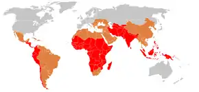 In industrialized nations, water sanitation and food handling improvements have reduced the number of cases.[66] Developing nations, such as those found in parts of Asia and Africa, have the highest rates of typhoid fever. These areas have a lack of access to clean water, proper sanitation systems, and proper health-care facilities. For these areas, such access to basic public-health needs is not in the near future.[67]