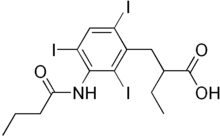 Tyropanoic acid and its salt sodium tyropanoate are radiocontrast agents used in cholecystography (X-ray diagnosis of gallstones). Trade names include Bilopaque, Lumopaque, Tyropaque, and Bilopac.[1] The molecule contains three heavy iodine atoms which obstruct X-rays in the same way as the calcium in bones to produce a visible image. After injection it is rapidly excreted into the bile.[2]