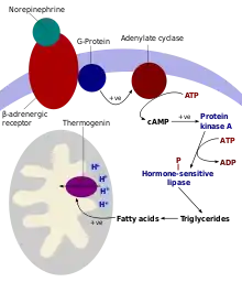 UCP1 is activated in the brown fat cell by fatty acids and inhibited by nucleotides.[6] Fatty acids are released by the following signaling cascade: Sympathetic nervous system terminals release Norepinephrine onto a Beta-3 adrenergic receptor on the plasma membrane. This activates adenylyl cyclase, which catalyses the conversion of ATP to cyclic AMP (cAMP). cAMP activates protein kinase A, causing its active C subunits to be freed from its regulatory R subunits. Active protein kinase A, in turn, phosphorylates triacylglycerol lipase, thereby activating it. The lipase converts triacylglycerols into free fatty acids, which activate UCP1, overriding the inhibition caused by purine nucleotides (GDP and ADP). During the termination of thermogenesis, thermogenin is inactivated and residual fatty acids are disposed of through oxidation, allowing the cell to resume its normal energy-conserving state.
