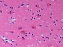 Microphotograph of HE stained section of human brain tissue upon acute ischemic stroke