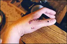 Gamekeeper's thumb (also known as skier's thumb or UCL tear) is a type of injury to the ulnar collateral ligament (UCL) of the thumb. The UCL may be merely stretched, or it may be torn from its insertion site into the proximal phalanx of the thumb;[1] in approximately 90% of cases part of the bone is actually avulsed from (sheared away from) the joint.[2] This condition is commonly observed among gamekeepers and Scottish fowl hunters, as well as athletes (such as volleyballers and soccer goalkeepers). It also occurs among people who sustain a fall onto an outstretched hand while holding a rod, frequently skiers grasping ski poles.[3]