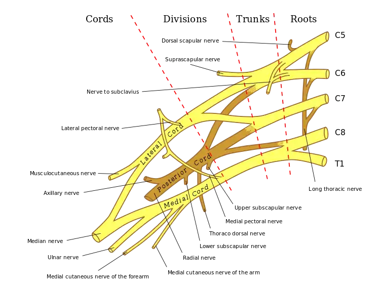 - Anatomy figure: 05:03-15 at Human Anatomy Online, SUNY Downstate Medical Center - "The major subdivisions and terminal nerves of the brachial plexus."