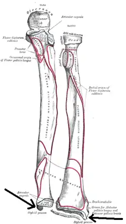 Bones of left forearm seen from front (ulnar styloid process labeled at bottom left)