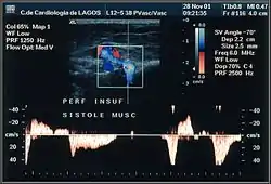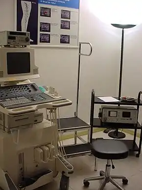 The ultrasound equipment must be of sufficiently high quality in order to give a correct image processing result, which can then provide invaluable information, mainly at the superficial level. It must be able to provide both color and Doppler imaging; technologies that developed alongside the development of ultrasound. The use of Doppler measurements which trace the echoes of the generated soundwaves received by the probe, enable the direction and the velocity of the blood flow, to be depicted. The overlay of color onto the Doppler information lets these images be seen more clearly.[8] The choice of a probe will depend on the depth needed to be studied. For example, the superficial venous system (SVS) can be very well examined using a high frequency probe of 12 MHz. For patients who have thick adipose tissue a probe of 7.5 MHz will be required. Deep veins require probes of around 6 MHz whilst the abdominal vessels are better studied with probes of between 4 and 6 MHz.[9] In summary, three probes are needed together with a top level scanner. Also, the proper use of the scanner calls for a high level of expertise, so that the examiner must be well qualified and experienced in order to give effective results. In contrast to arterial ultrasonography the wall of the vein is not relevant and importance is given to the hemodynamic conclusions that the examiner can obtain in order to provide a valuable report. (Hemodynamics is the study of blood flow and of the laws that govern the circulation of blood in the blood vessels).[5] It follows that the examiner knowledge of venous hemodynamics is crucial, which can be a real barrier to a radiologist untrained in this field, who might wish to carry out these examinations.[10][11] Specialized training in venous ultrasonography is not undertaken in some countries, which undermines best practice, mainly when varicose veins need to be examined.[12]