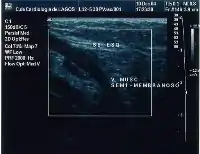 The small saphenous vein (SSV), runs along the posterior aspect of the leg as far as the popliteal region, in the upper calf. Here it enters the popliteal space which is located between the two heads of the gastrocnemius muscle where it usually drains above the knee joint in the popliteal vein or a little less often in the GSV or other deep muscular veins of the thigh.[38] The use of ultrasonography has allowed a number of variations to be shown at this level; when no contact is made with the popliteal vein it might be seen to drain in the GSV, at a variable level; or, it may merge with the Giacomini vein and drain in the GSV at the superior 1/3 of the thigh. It can also but rarely, drain in the vein of the semimembranosus (thigh muscle) (shown below). Usually though, it connects with a perforator vein at its middle 1/3.[1] To check for insufficiency, the Paraná maneuver is very useful.[20]
