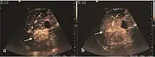 Liver abscess have heteromorphic ultrasound appearance, the most typical being that of a mass with irregular shapes, fringed, with fluid or semifluid content, with or without air inside. Doppler examination shows the lack of vessels within the lesion. CEUS exploration shows hyperenhancement during arterial phase close to the lesion, this being suggestive of a liver parenchymal hyperemia. During venous and sinusoidal phase the pattern is hypoechoic, and the central fluid is contrast enhanced. CEUS examination is useful because it confirms the clinical suspicion of abscess. In addition, it allows for an accurate measurement of the collection size and an indication regarding its topography inside the liver (lobe, segment).
