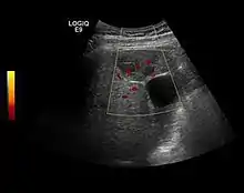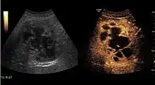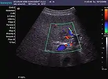 HCC appearance on 2D ultrasound is that of a solid tumor, with imprecise delineation, with heterogeneous structure, uni- or multilocular (encephaloid form). An "infiltrative" type is also described which is difficult to discriminate from liver nodular reconstruction in cirrhosis. Typically HCC invades liver vessels, primarily the portal veins but also the hepatic veins . Doppler examination detects a high speed arterial flow and low impedance index (correlated with described changes in tumor angiogenesis). The spatial distribution of the vessels is irregular, disordered. CEUS examination shows hyperenhancement of the lesion during the arterial phase. During the portal venous phase there is a specific "wash out" of ultrasound contrast agent (UCA) and the tumor appears hypoechoic during the late phase. Poorly differentiated tumors may have a stronger wash out leading to an isoechoic appearance to the liver parenchyma during portal venous phase. This appearance was found in approx. 30% of cases. The described changes have diagnostic value in liver nodules larger than 2 cm.
