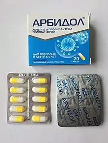 Umifenovir, sold under the brand name Arbidol, is an antiviral medication for the treatment of influenza infection used in Russia[4] and China. The drug is manufactured by Pharmstandard (Russian: Фармстандарт). Russian and China studies have shown it to be effective and it is approved in both countries while, it is not approved by the US FDA for the treatment or prevention of influenza because it was never applied for FDA approval since the drug company is in Russia not the US.[5]