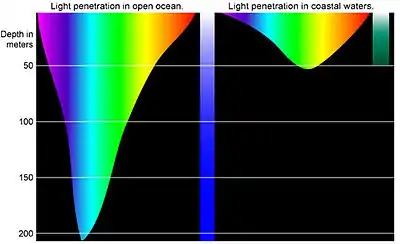 Water attenuates light due to absorption[2] which varies as a function of frequency. In other words, as light passes through a greater distance of water color is selectively absorbed by the water. Color absorption is also affected by turbidity of the water and dissolved material.