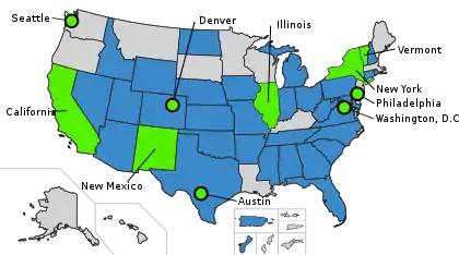 In most jurisdictions, local governments have the ability to pass ordinances, so long as they do not conflict with state law. San Francisco (California), Philadelphia (Pennsylvania), Seattle (Washington), Washington (District of Columbia), West Hollywood (California), Austin (Texas), Cleveland (Ohio), New York City, Denver (Colorado),[63] and the US states of Vermont, New Mexico, New York State,[64] Illinois, and California - have passed measures mandating that single-occupancy toilets in public spaces be labeled as unisex (or gender-neutral).[65][66] Additionally, the 2021 edition of the International Plumbing Code(in use by 35 states, Puerto Rico, Guam, and DC) will require the same as individual states adopt the new edition of the code.[67][68]