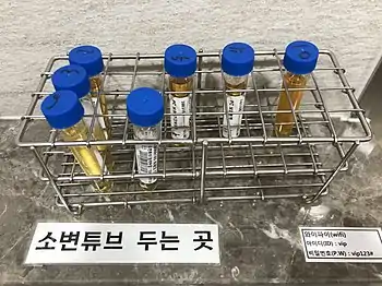 Conventionally, proteinuria is diagnosed by a simple dipstick test, although it is possible for the test to give a false negative reading,[16] even with nephrotic range proteinuria if the urine is dilute. False negatives may also occur if the protein in the urine is composed mainly of globulins or Bence Jones proteins because the reagent on the test strips, bromophenol blue, is highly specific for albumin.[6][17] Traditionally, dipstick protein tests would be quantified by measuring the total quantity of protein in a 24-hour urine collection test, and abnormal globulins by specific requests for protein electrophoresis.[2][18] Trace results may be produced in response to excretion of Tamm–Horsfall mucoprotein.