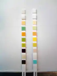 ![]() The Multistix urine test strip showing the manufacturer’s coloured scale. | |