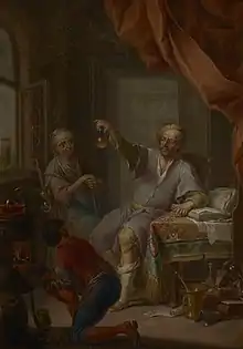 Records of urinalysis for uroscopy date back as far as 4000 BC, originating with Babylonian and Sumerian physicians.[1] At the outset of the 4th century BC Greek physician Hippocrates hypothesized that urine was a "filtrate" of the four humors, and limited possible the diagnoses resulting from this method to issues dealing with the bladder, kidneys, and urethra.[2] This in turn led another Greek physician, Galen, to refine the idea down to urine being a filtrate of only blood, and not of black bile, yellow bile, or phlegm.