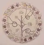 The uroscopy wheel is a diagram that linked the color of urine to a particular disease. It usually has twenty different uroscopy flasks with urine of different colors aligned around the border of the circle. Each flask has a line that connects it to a summary of a particular disease. This allowed doctors to have a quick reference guide to twenty different types of urine.[6]