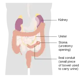 ![]() Diagram showing how a urostomy is made using an ileal conduit technique | |