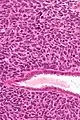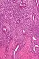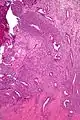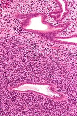 | Micrograph of a uterine adenosarcoma showing a mitotically active malignant stroma and benign glands. H&E stain. | |