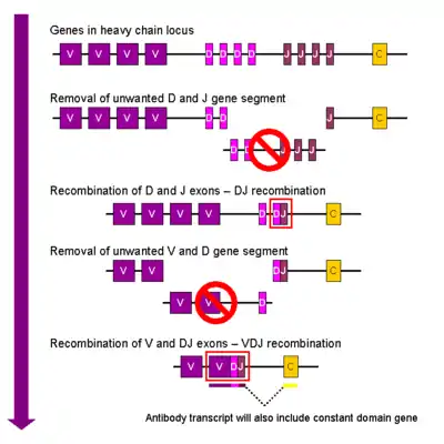 In the developing B cell, the first recombination event to occur is between one D and one J gene segment of the heavy chain locus. Any DNA between these two gene segments is deleted. This D-J recombination is followed by the joining of one V gene segment, from a region upstream of the newly formed DJ complex, forming a rearranged VDJ gene segment. All other gene segments between V and D segments are now deleted from the cell's genome. Primary transcript (unspliced RNA) is generated containing the VDJ region of the heavy chain and both the constant mu and delta chains (Cμ and Cδ). (i.e. the primary transcript contains the segments: V-D-J-Cμ-Cδ). The primary RNA is processed to add a polyadenylated (poly-A) tail after the Cμ chain and to remove sequence between the VDJ segment and this constant gene segment. Translation of this mRNA leads to the production of the IgM heavy chain protein.