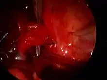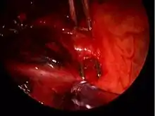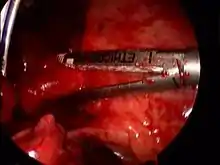 VATS lobectomy is the same as lobectomy performed via thoracotomy in that the pulmonary artery, pulmonary vein, and bronchus to the involved pulmonary lobe are individually dissected, ligated and divided. Generally, endoscopic stapling devices are used to ligate and divide the vessels and the bronchus however conventional suture material can also be used. During VATS lobectomy, the structures being operated on are not directly visualized with the naked eye but are visualized solely with a rigid thoracoscope. A camera attached to the thoracoscope transmits the image to a video screen, which allows surgeons and assistants to observe the flow of the operation. Surgical specimens are placed into a water-tight bag and removed from the chest without morcellization (i.e. breaking up the specimen into small pieces before removal); this prevents seeding of the VATS incisions with tumor cells and allows for an intact specimen for pathology examination and cancer staging. Removal of lymph nodes from the mediastinum is not compromised by VATS and remains a cornerstone of the surgical therapy of lung cancer. Visualization is enhanced due to the magnification afforded by the fiberoptic thoracoscope and a 30-degree angle of visualization aids in looking around corners. However, because the incisions are too small to allow passage of the surgeon's hands into the thorax, the surgeon's tactile input is compromised. VATS operations rely on a thorough understanding of pulmonary anatomy to allow for strategically placed incisions (usually 3–5 incisions total). The main advantages of VATS over thoracotomy are that major muscles of the chest wall are not divided and rib spreaders that can lead to rib fractures or costovertebral joint pain are not used. This results in a hospital length of stay after VATS lobectomy generally reported to range from 3–5 days,[2] or roughly half that for lobectomy via thoracotomy.