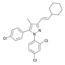 VCHSR is a drug used in scientific research which acts as a selective antagonist of the cannabinoid receptor CB1. It is derived from the widely used CB1 antagonist rimonabant, and has similar potency and selectivity for the CB1 receptor, but has been modified to remove the hydrogen bonding capability in the C-3 substituent region, which removes the inverse agonist effect that rimonabant produces at high doses, so that VCHSR instead acts as a neutral antagonist, blocking the receptor but producing no physiological effect of its own.[1][2]