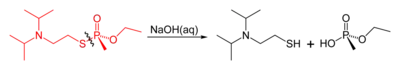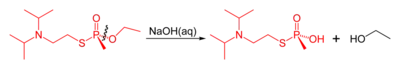 Like other organophosphorus nerve agents, VX may be destroyed by reaction with strong nucleophiles. The reaction of VX with concentrated aqueous sodium hydroxide results in two competing solvolysis reactions: cleavage of either the P–O or P–S esters. Although the P–S cleavage is the dominant pathway, the product of P–O bond cleavage is the toxic phosphonic thioester EA-2192 and both reactions are slow.[23] In contrast, reaction with the hydroperoxide anion (hydroperoxidolysis) leads to exclusive cleavage of the P–S bond and a more rapid overall reaction.[23][24]