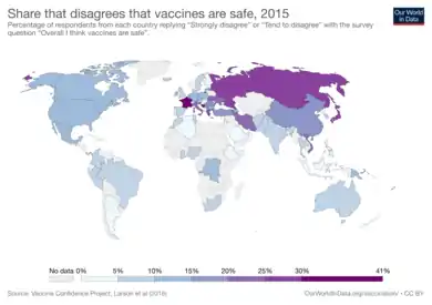 Various disputes have arisen over the morality, ethics, effectiveness, and safety of vaccination. Some vaccination critics say that vaccines are ineffective against disease[101] or that vaccine safety studies are inadequate.[101] Some religious groups do not allow vaccination,[102] and some political groups oppose mandatory vaccination on the grounds of individual liberty.[85] In response, concern has been raised that spreading unfounded information about the medical risks of vaccines increases rates of life-threatening infections, not only in the children whose parents refused vaccinations, but also in those who cannot be vaccinated due to age or immunodeficiency, who could contract infections from unvaccinated carriers (see herd immunity).[103] Some parents believe vaccinations cause autism, although there is no scientific evidence to support this idea.[104] In 2011, Andrew Wakefield, a leading proponent of the theory that MMR vaccine causes autism, was found to have been financially motivated to falsify research data and was subsequently stripped of his medical license.[105] In the United States people who refuse vaccines for non-medical reasons have made up a large percentage of the cases of measles, and subsequent cases of permanent hearing loss and death caused by the disease.[106]