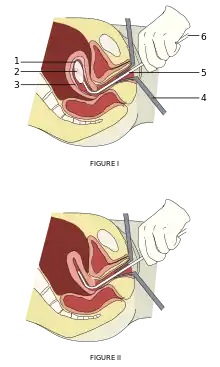 The clinician places a speculum into the vagina and cleanses the cervix then uses a local anesthetic using lidocaine in a paracervical block or intracervical injection into the cervix.[15] The clinician may use instruments called "dilators" to gently open the cervix, or sometimes medically induce cervical dilation with drugs or osmotic dilators administered before the procedure.[16][17] Finally, a sterile cannula is inserted into the uterus. The cannula may be attached via tubing to the pump if using an electric vacuum, or attached directly to a syringe if using a manual vacuum aspirator. The pump creates a vacuum which empties uterine contents.[12]