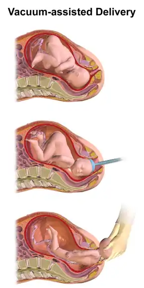 Vacuum extraction (VE), also known as ventouse, is a method to assist delivery of a baby using a vacuum device. It is used in the second stage of labor if it has not progressed adequately. It may be an alternative to a forceps delivery and caesarean section. It cannot be used when the baby is in the breech position or for premature births. The use of VE is generally safe, but it can occasionally have negative effects on either the mother or the child.[1] The term comes from the French word for "suction cup".