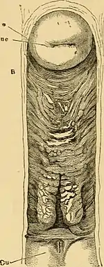 Other structures can be present on the vaginal wall though most of the time these can be differentiated from rugae.[12][13] Vaginal cysts can be small protrusions into the vagina that can be felt or palpated by a clinician. Vaginal inclusion cysts can appear as small bumps and can develop after childbirth.[12] Other small structures or protrusions can be Gartner duct cysts, patches of endometrial tissue, and benign tumors.[12][14] These cystic structures can obliterate the rugae and is a clue to their presence.[15] The absence of vaginal rugae seen in the normal vagina of a healthy woman may be an indication of a prolapsed bladder (cystocele) or rectocele.[13][12] An enterocele, or bulging of the bowel into the vagina can also cause vaginal rugae to disappear.[16] The absence of vaginal rugae may also be an indicator of pelvic organ prolapse.[17][18][19] Vaginal rugae disappear in those with an estrogen deficiency.[7][20]