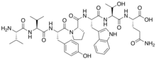 Valorphin, also known as VV-hemorphin-5, is a naturally occurring, endogenous opioid heptapeptide of the hemorphin family with the amino acid sequence H-Val-Val-Tyr-Pro-Trp-Thr-Gln-OH.[1][2][3] It is produced in the body via proteolyic cleavage of residues 33-39 of the β-chain of hemoglobin.[2][4] Valorphin binds preferentially to the μ-opioid receptor and produces effects such as analgesia and self-administration in animals.[1][2] It also possesses cytotoxic and antiproliferative properties against tumor cells,[3][4][5][6] the mediation of which, because they are reversed by naloxone, appears to be dependent on the opioid receptors.[5]