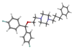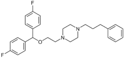 Vanoxerine (GBR-12909) is a piperazine derivative which is a potent and selective dopamine reuptake inhibitor (DRI). GBR-12909 binds to the target site on the dopamine transporter (DAT) ~ 50 times more strongly than cocaine,[1] but simultaneously inhibits the release of dopamine. This combined effect only slightly elevates dopamine levels, giving vanoxerine only mild stimulant effects.[2] Vanoxerine has also been observed to be a potent blocker of the IKr (hERG) channel.[3] GBR-12909 also binds with nanomolar affinity to the serotonin transporter.[4]