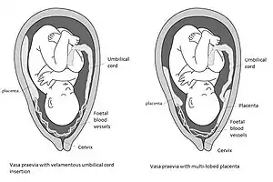 Vasa previa is seen more commonly with velamentous insertion of the umbilical cord, accessory placental lobes (succenturiate or bilobate placenta), multiple gestation, and in vitro fertilisation pregnancy. In IVF pregnancies, incidences as high as one in 300 have been reported. The reasons for this association are not clear, but disturbed orientation of the blastocyst at implantation, vanishing embryos and the increased frequency of placental morphological variations in IVF pregnancies have all been postulated.