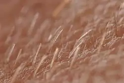 Vellus hair is short, thin, light-colored, and barely noticeable hair that develops on most of a person's body during childhood. Exceptions include the lips, the back of the ear, the palm of the hand, the sole of the foot, some external genital areas, the navel, and scar tissue. The density of hair – the number of hair follicles per area of skin – varies from person to person. Each strand of vellus hair is usually less than 2 mm (1/13 inch) long and the follicle is not connected to a sebaceous gland.[1]
