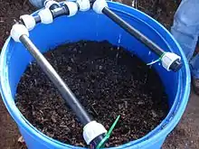 Vermifilters are enclosed reactors made from durable materials that eliminate the entry of vermin, usually plastic or concrete. Ventilation must be sufficient to ensure an aerobic environment for the worms and microorganisms, while also inhibiting entry of unwanted flies. Temperature within the reactor needs to be maintained within a range suitable for the species of compost worms used.[10]