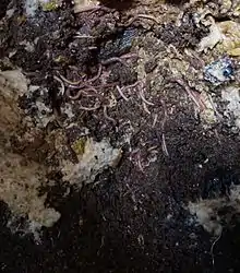 Vermifilters are a type of wastewater treatment biofilter or trickling filter, but with the addition of earthworms to improve treatment efficiency.[4] Vermifilters provide an aerobic environment and wet substrate that facilitates microorganism growth as a biofilm. Microorganisms perform biochemical degradation of organic matter present in wastewater. Earthworms regulate microbial biomass and activity by directly or/and indirectly grazing on microorganisms.[5] Biofilm and organic matter consumed by composting earthworms is then digested into biologically inert castings (humus).[6] The vermicast is incorporated into the media substrate, slowly increasing its volume. When this builds up, it can be removed and applied to soil as an amendment to improve soil fertility and structure.