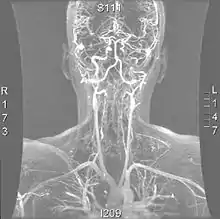 - Provenzale JM, Sarikaya B (October 2009). "Comparison of test performance characteristics of MRI, MR angiography, and CT angiography in the diagnosis of carotid and vertebral artery dissection: a review of the medical literature". AJR Am J Roentgenol. 193 (4): 1167–74. doi:10.2214/AJR.08.1688. PMID 19770343.