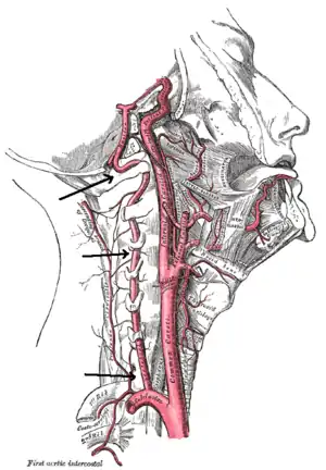 | Arteries of the neck, with arrows indicating the right vertebral artery | |