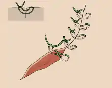 The vertical mattress stitch, often called vertical Donati stitch (named after the Italian surgeon Mario Donati),[1] is a suture type used to close skin wounds. The advantages of the vertical mattress suture are that it provides closure for both deep and superficial layers, and also allows perfect eversion and vertical opposition of the superficial skin edges.[2][3][4][5] Its disadvantage is a relatively high propensity to dig into skin and cause prominent stitch mark scars.