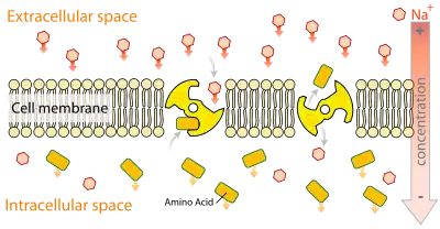 The active transport of monoamines from the cytosol into storage vesicles operates against a large (>105) concentration gradient. Secondary active transport is the type of active transport used, meaning that VMAT1 is an antiporter. This transport is facilitated via proton gradient generated by the protein proton ATPase. The inward transport of the monoamine is coupled with the efflux of two protons per monoamine.[12] The first proton is thought to cause a change in VMAT1's conformation, which pushes a high affinity amine binding site, to which the monoamine attaches. The second proton then causes a second change in the conformation which pulls the monoamine into the vesicle and greatly reduces the affinity of the binding site for amines. A series of tests suggest that His419, located between TMDs X and XI, plays the key role in the first of these conformational changes, and that Asp431, located on TMD XI, does likewise during the second change.[9]