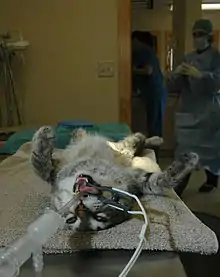 Veterinary anesthesia is anesthesia performed on non-human animals by a veterinarian or a Registered Veterinary Technician.[1] Anesthesia is used for a wider range of circumstances in animals than in people, due to animals' inability to cooperate with certain diagnostic or therapeutic procedures. Veterinary anesthesia includes anesthesia of the major species: dogs, cats, horses, cattle, sheep, goats, and pigs, as well as all other animals requiring veterinary care such as birds, pocket pets, and wildlife.[1]