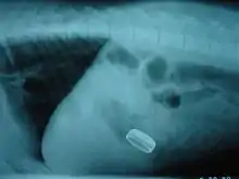 A variety of non-edible objects are commonly swallowed by dogs, cats, and cattle. These foreign bodies can cause obstruction of the gastrointestinal tract causing severe vomiting and resulting electrolyte imbalances. The stomach (gastrotomy) or intestine (enterotomy) can be surgically opened to remove the foreign body. Necrotic intestine can be removed (enterectomy) and repaired with intestinal anastomosis. Foreign bodies can also be removed by endoscopy, which although requires general anesthesia does not require surgery and significantly decreases recovery time.[19] However, endoscopic foreign body retrieval is anatomically limited to objects lodged in the esophagus, the stomach or the colon. The condition in cattle is known as hardware disease.
