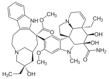 Vindesine, also termed Eldisine, is a semisynthetic vinca alkaloid derived from the flowering plant Catharanthus roseus.[1] Like the natural (e.g. vinblastine and vincristine) and semisynthetic vinca alkaloids (e.g. vinorelbine and vinflunine) derived from this plant, vindesine is an inhibitor of mitosis that is used as a chemotherapy drug.[2] By inhibiting mitosis, vinedsine blocks the proliferation of cells, particularly the rapidly proliferation cells of certain types of cancer. It is used, generally in combination with other chemotherapeutic drugs, in the treatment of various malignancies such as leukaemia, lymphoma, melanoma, breast cancer, and lung cancer.[3]